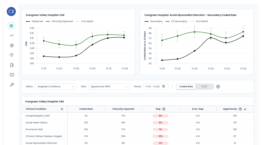 ClinIntell takes a step back and looks across thousands of your patients to identify broader patterns, systemic clinical conditions, documentation gaps, and areas where CDI efforts have stopped delivering results.