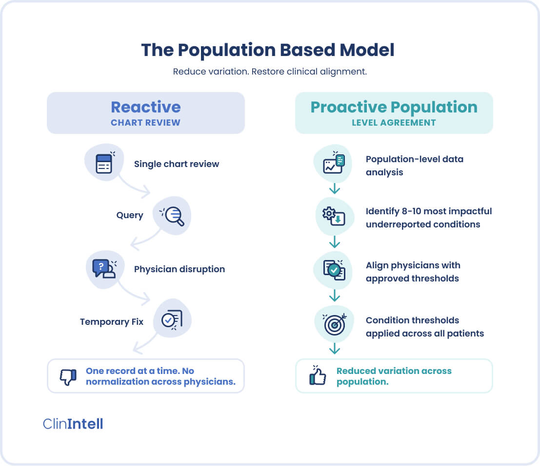 But this approach never addresses the root problem. Remember, the queries are only the symptoms of the real problem, which is variation. Physicians document based on their own mental models, definitions, and priorities — not a shared, population-informed or strategy-driven standard.